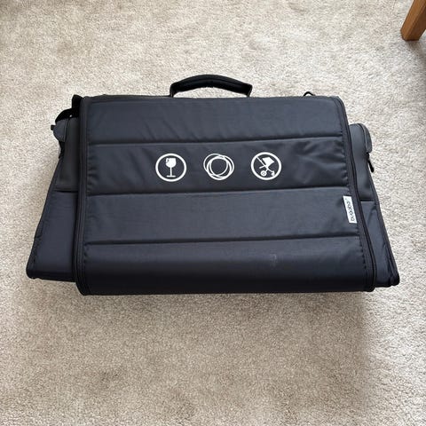 Bugaboo vaunujen/rattaiden kuljetuslaukku. Paljon maailmaa nähnyt mutta edelleen toimiva. Erillinen pyörien säilytyspussi kadonnut mutta rattaat/vaunut kulkeutuu hyvin ilman sitäkin. Rattaiden lisäksi kuljetuslaukkuun mahtuu kätevästi lisäksi myös mm. vaipat, uimalelut, potkulauta yms muuta reissussa tarpeellista joka vie matkalaukussa tilaa.