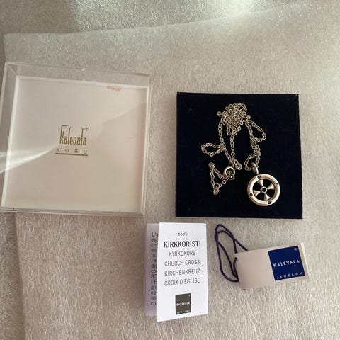 Kalevalan kirkkoristi kaulakoru, hopeinen. Ketjun pituus 45cm/50cm. Todella hyvässä kunnossa, tarvitsee vain kevyen putsauksen. Sijaitsee Lahdessa.