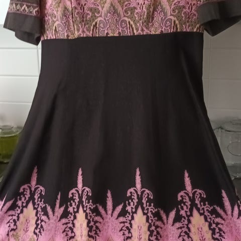 Oletettavasti se on ompilijan tekemä, silloin vaatteet oli aika tyköistuvia, joten koko voisi olla S. Rinnanympärys 80cm, mekon pituus 94cm.