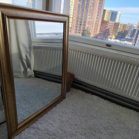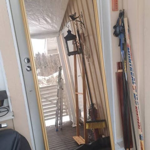Punavuoren Galleria Albert IX :stä aikoinaan ostettu peili hienolla kultareunuksella. Mukana tulee kiinnityskappaleet, joita emme käyttäneet kun nojasi seinään.