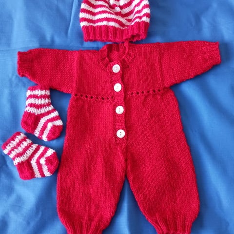 Erilaisista langoista kudottuja pipoja, sukkia ja tumppuja 43 cm pitkälle baby born nukelle.