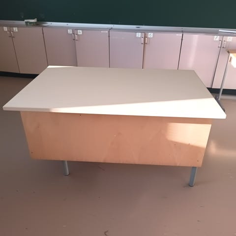 Kirjoituspöytä, jossa vaalea puupintainen pöytätaso ja metallijalat. Pöydässä on molemmilla puolilla laatikostot, joissa useita vetolaatikoita pientavaroiden ja paperien säilytykseen. Sopii esimerkiksi työhuoneeseen, toimistoon tai opiskelupöydäksi. Pöydän tausta on umpinainen, joten sen voi sijoittaa myös keskelle huonetta.