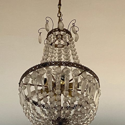 Kristallikruunu kuudella polttimolla. Polttimoille saatavilla valkoiset varjostimet. Vain nouto Kotkansaarelta.
