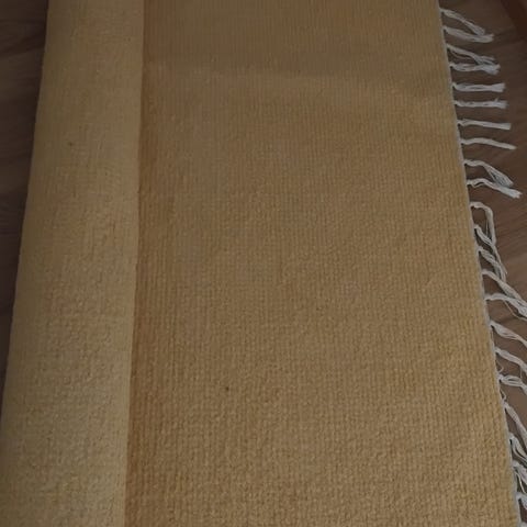 Keltainen matto jossa on hapsut,mitat 64x200cm. Sopii käytettäväksi esimerkiksi olohuoneessa, makuuhuoneessa tai eteisessä.Siisti,ehjä,kevyt räsymatto tyyppinen.Voi pestä vaikka pesukoneessa tarvittaessa.Hp.15€.Koiratalous.