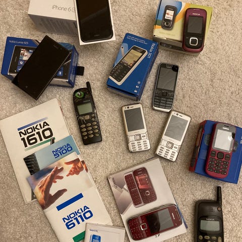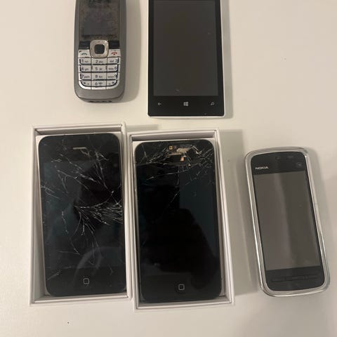 Toimivina varastoitu. Vanhoja Nokialaisia sekä muutama iPhone. Vanhin iPhone aika virheetön 4.