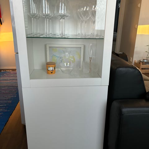 IKEA vitriinikaappi, jossa valkoinen runko ja lasiovet. Kaapissa on useita säädettäviä hyllyjä, jotka soveltuvat esimerkiksi astioiden, kirjojen tai koriste-esineiden säilytykseen ja esillepanoon. Materiaalina maalattu puupohjainen levy ja lasi. Kaappi sopii olohuoneeseen, ruokailutilaan tai muuhun sisätilaan säilytys- ja vitriinikaapiksi.