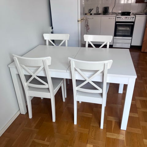 Hyvässä kunnossa oleva ruokailuryhmä, yksi tuoli vähän rikki. Vain nouto.