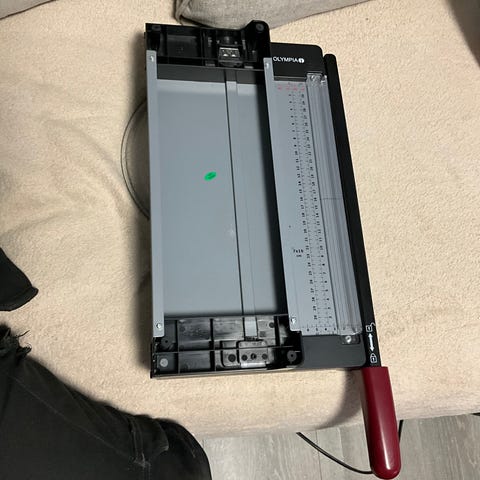 Tässä elämää nähnyt, mutta hyvin toimiva ja leikkaava rullaleikkuri. Mukava käyttää, terä teroittaa itseään rullatessaan. Jämäkkä ja laadukas. Olen käyttänyt aiemmin tätä lähinnä suurkuvatulosteiden ja julisteiden trimmaamiseen.