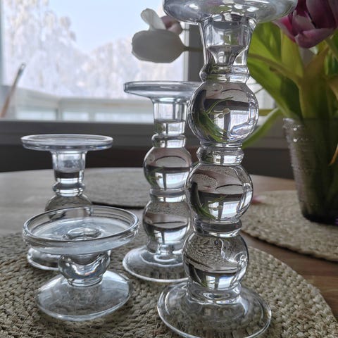 Finnmari lasiset kynttilänjalat 3kpl. Korkeudet 19cm, 13cm, 7cm.