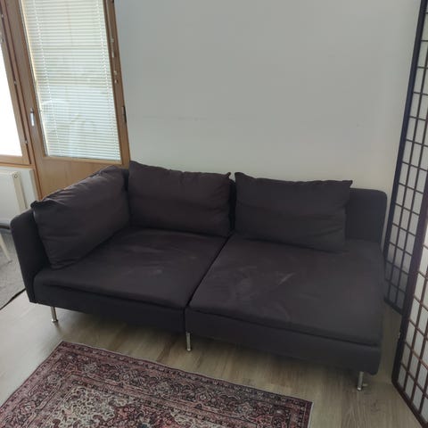 Sohva myydään suoraan käytöstä, ei ole pesty joten joitakin pesulla lähteviä tahroja voi olla (en ole tarkemmin katsonut). Ei kuitenkaan mitään merkittäviä esim ruokatahroja tmv.