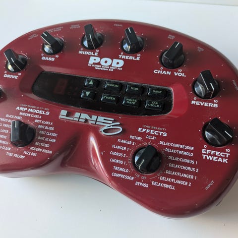 Line 6 POD 2.0 kitaramultiefekti. Punainen pöytämallinen kitaraprosessori, jossa useita vahvistinmalleja ja efektejä, kuten särö, chorus, delay ja reverb. Laitteessa on säätimet muun muassa drive-, bass-, middle-, treble- ja kanavavolyymin ohjaukseen. Takapaneelissa liitännät kitaralle, MIDI‑sisään/ulos sekä USB‑ ja verkkoliitännät. Soveltuu sähkökitaran äänenmuokkaukseen kotisoitossa, äänityksissä ja harjoittelussa.