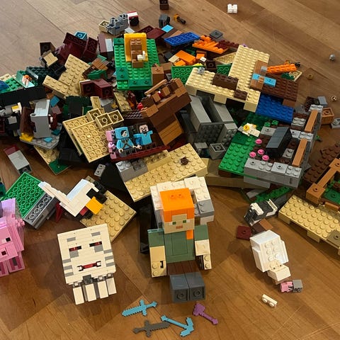 LEGO Minecraft rakennussarja. Setti sisältää palikoita Minecraft-maailman rakentamiseen, kuten talon, tornin, puita, veden ja viljelyalueen. Mukana on myös useita hahmoja ja eläimiä sekä ohjekirja eri rakennusvaihtoehdoille. Soveltuu LEGO Minecraft -teemasta pitäville rakentajille.