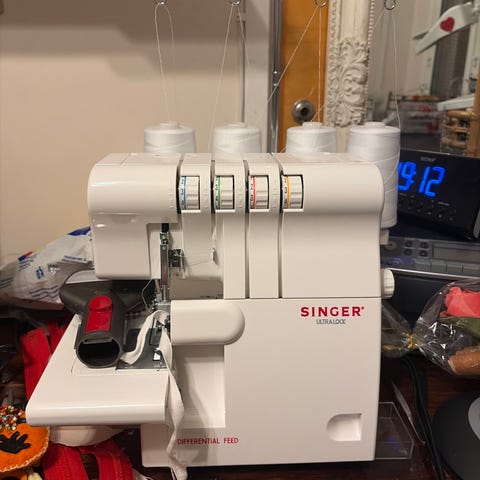 Pitkään kaapissa lojunut. Vaatii huollon heittää ommellessa langan pois neulalta. Annan hyvän ja edullisen korjaajan numeron matkaan. Langat saa mukaan.