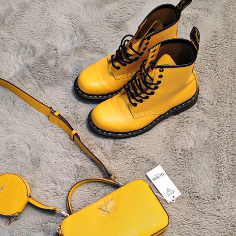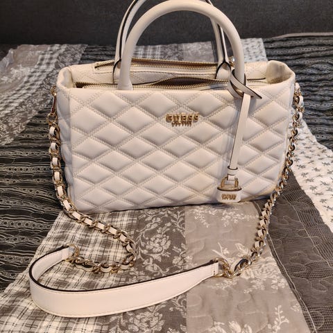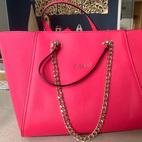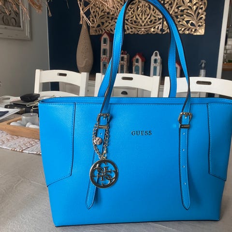 Guess shopper-laukku keltaista kuviollista keinonahkaa. Laukussa on kaksiosaiset olkahihnat niittiyksityiskohdilla ja riippuva logolappu. Pinta on kauttaaltaan kohokuvioitu Guess-logokuviolla. Sisäpuolella on vaalea vuori, yksi vetoketjutasku ja avotaskuja pienten tavaroiden säilytykseen. Laukku suljetaan vetoketjulla ylhäältä. Sopii arkilaukuksi ja tilavaksi käsilaukuksi. Käyttämätön ja dust bagissä.
