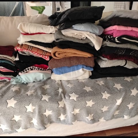 Tässä kuvassa lähinnä takkeja, neuleita ja huppareita.