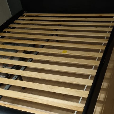 Sängyn runko hyvässä kunnossa. Patja puhdas mutta päällinen hieman kulunut mutta ehjä.