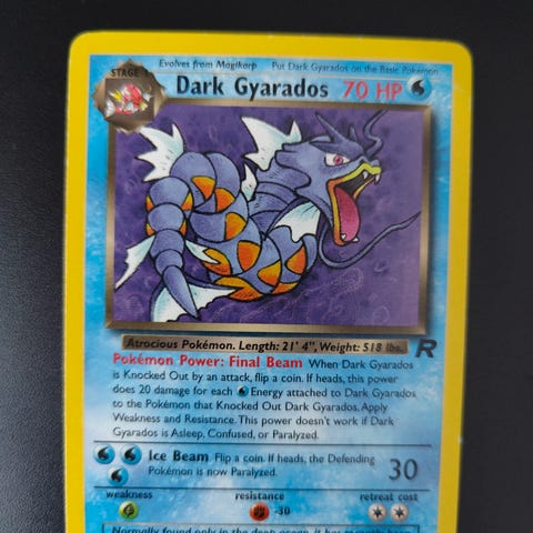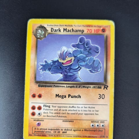Pokémon Team Rocket -sarjan Dunkles Arbok -keräilykortti. Kortti on saksankielinen ja esittää Arbok-hahmoa. Kortin etupuolella on värillinen kuvitus ja pelitiedot, taustapuolella perinteinen sininen Pokémon-kortin takaosa. Soveltuu Pokémon-korttipeliin tai keräilyyn.
