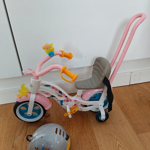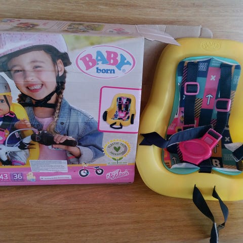 Tarroilla polkupyörään kiinnitettävä baby born- nuken istuin.