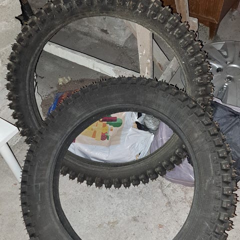 Varastossa maanneet piikkirenkaat. Eivät ole olleet käytössä moneen vuoteen.