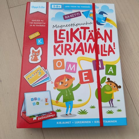 Oppi&ilo Raketti Magneettipuuha leikitään kirjaimilla on kirjainpeli 3–8-vuotiaille lapsille. Pakkauksessa on magneettinen alusta, kirjainmagneetteja sekä erilaisia tehtäväkortteja ja kuvamagneetteja. Pelin avulla voi harjoitella kirjaimia, tavuja ja sanojen muodostamista. Magneettiosat pysyvät kiinni alustassa, joten peliä voi käyttää kotona tai matkalla. Sisältää yli 150 magneettia. MMM