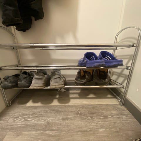 Metallinen kenkäteline ja muovinen kurasuoja.