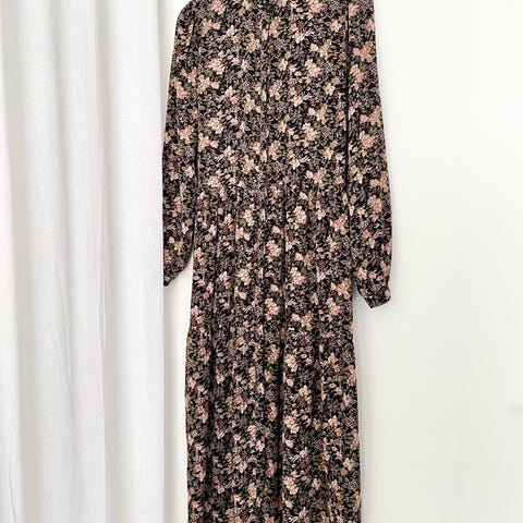 Violetinkirjava kukkamekko/maksimekko, alla lila alusmekko. Siistissä kunnossa.