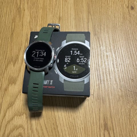 Kaikinpuolin siisti Polar Grit X- urheilukello. Rannekkeesta puuttuu kiinnityslenkki ja akku on kohtalainen.