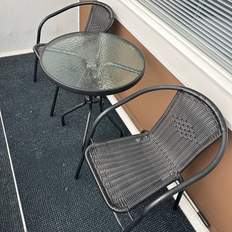 Ruokailuryhmä, johon kuuluu suorakulmainen pöytä ja neljä tuolia. Pöydässä on lasikansi ja rottinkijäljitelmä- tai rottinkipunosreunus sekä puiset, viistot jalat. Tuoleissa on samaa punottua materiaalia ja puiset jalat, istuimissa pehmusteet. Ryhmä soveltuu esimerkiksi ruokailuun tai oleskeluun sisätiloissa tai lasitetulla parvekkeella/terassilla, käyttöympäristöstä riippuen. Kunto käytetty hyvä. Yhdestä tuolista puuttuu pehmuste. Ovh 1000e