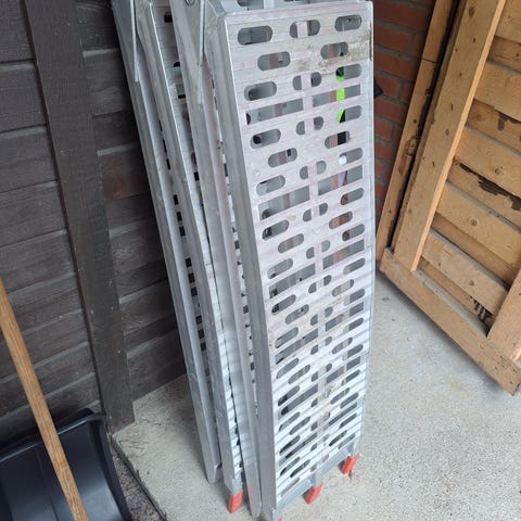 Uudenveroinen alumiiniramppi, jota käytetty kerran MP:n lastaamiseen peräkärryyn ja toisen kerran MP:n laskemiseen kärrystä. Ostettu Puuilosta, jossa hinta 89€.