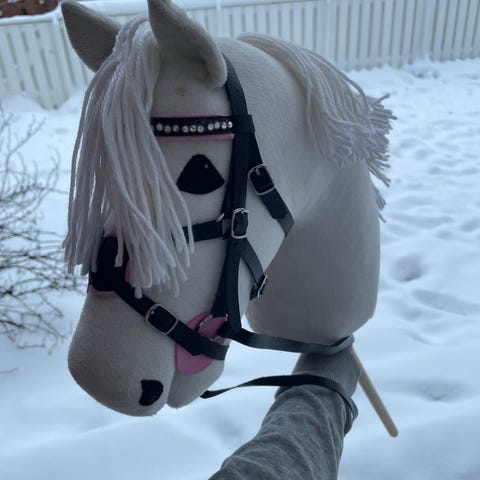 Kerman värisestä velboasta valmistettu Taikakeppari keppihevonen pinkeillä suitsilla.