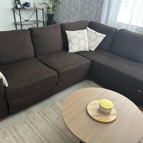Siistikuntoinen vuoteeksi levitettävä kulmasohva edullisesti. Ehjä sininen kangasverhoilu ja samaa kangasta olevat tyynyt + kaksi vaaleaa. Vuodevaatteille laatikko lyhyemmän osan alla.