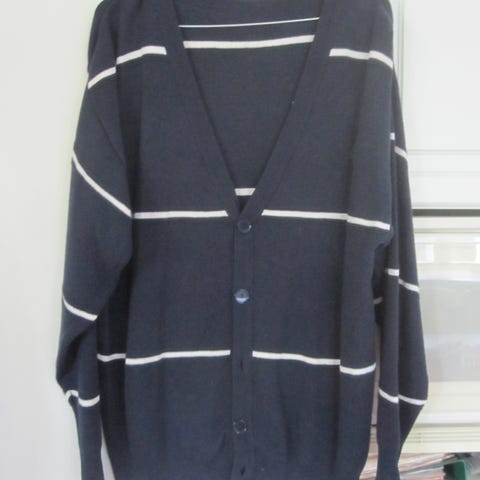 East West -merkin tummansininen miesten laadukas neuletakki, 55% villaa 45% puuvillaa, pesu villaohjelmalla.
