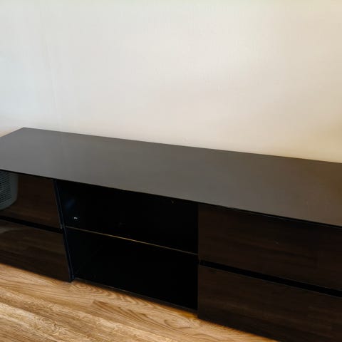 Must a neliömäinen sivupöytä. Sopii esimerkiksi olohuoneeseen sohvapöydäksi, yöpöydäksi tai lisätasoksi. Pöydässä on neljä jalkaa ja sileä kansitaso. Materiaali vaikuttaa olevan puupohjainen levymateriaali tai vastaava.