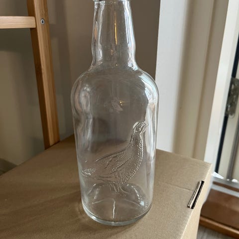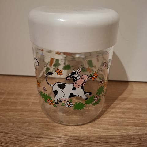 lasinen pullo, jossa värikäs lehmähahmokuvio ja punainen muovikansi. Pullo soveltuu esimerkiksi maidon, mehujen tai veden säilytykseen ja tarjoiluun kotikäytössä. Läpinäkyvä lasi helpottaa sisällön määrän seuraamista ja kuviointi tuo pulloon leikkisän ilmeen. Muovikansi suojaa sisältöä pölyltä ja roiskeilta.