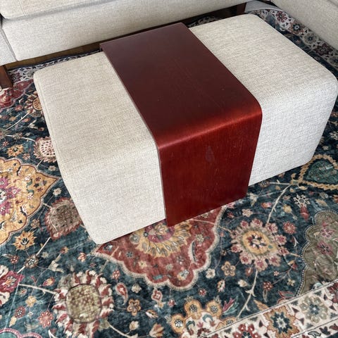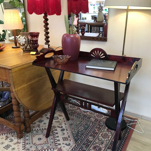 Tarjotinpöytä jota madallettu noin 7cm pikku sohvapöydäksi/ apupöydäksi. Mitat kuvissa ja yhdessä kulmassa lohkeama josta puuttuu pala. Jämäkkä ja kokoisekseen painava. Nouto. MobilePay