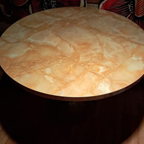 Pyöreä pöytä ja neljä harmaata kangaspäällysteistä tuolia. Kunto hyvä, pöydässä ei juurikaan käytön jälkiä. Yhdessä tuolissa kankaassa tahra, jonka saa todennäköisesti pestyä pois. Muuten tuolitkin hyvässä kunnossa. Vain nouto. Pöytä halkaisijaltaan 100cm.