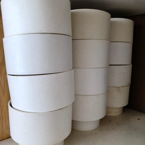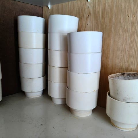 19 kpl Orthexin lautasellisia ruukkuja 14cm halkaisijalla. Valkoinen väri. Mukaan ruukku ja aluslautanen.
