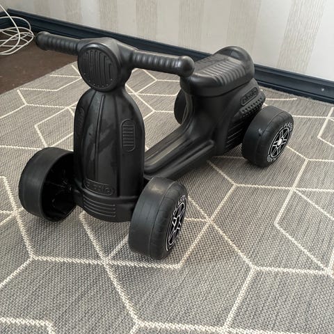 Rungossa on neljä pyörää ja matala istuinkorkeus, joka sopii pienille lapsille potkuteltavaksi ja työnnettäväksi sisä- tai ulkoleikkeihin.