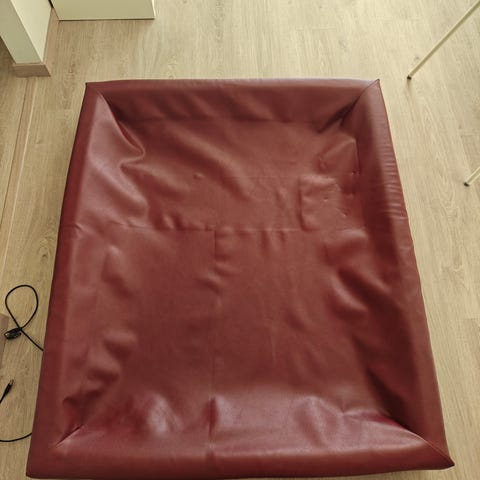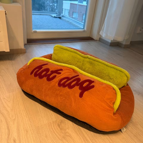 Harmaa koiran peti, jossa on paksut reunatyynyt kolmella sivulla. Keskiosa on tasainen ja pehmeä makuualusta. Sopii koiralle lepopaikaksi sisäkäyttöön. Materiaali on pehmeää plyysiä.
