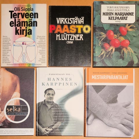 Neljä upeaa terveyskirjaa. Terveen elämän ABC. 831 sivua, suurteos, joka käsittelee sekä ruokaa että terveyteen vaikuttavia monia asioita. 8 euroa. Kyllikki Villan kirja teestä, 4 euroa. Suuri lääkärikirja 479 sivua, 7 euroa. Miten luonto parantaa. Monipuolinen kuvaus eri parannuskeinoista, joita on joko saatavana luonnosta tai joita voidaan hoitaa luonnollisella tavalla. 284 sivua tiivistä tietoa. Ilmoitan postikulun, kun kerrot, mitä haluat. Katso myös muut ilmoitukseni!