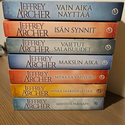 Jeffrey Archer "Clifton kronikka" sarjan kirjat Miekkaa vahvempi ja Maksun aika. Uuttavastaava kunto! Hinta3e/kpl, postitus 7e.
