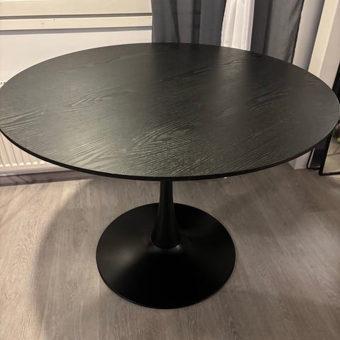 Pöytä on erittäin tukeva ja painava, ei keiku. Mukaan kuuluu viisi mustaa pinnatuolia, kaikki hyvässä kunnossa.