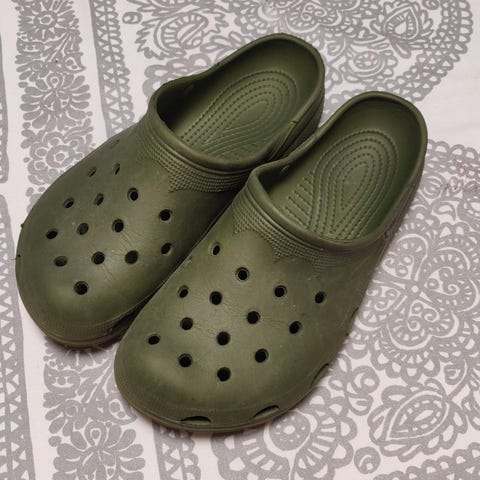 Kolmet Crocs-tyyppiset muovikengät ja Yhdet uimatossut. Kaikki kokoa 45.
