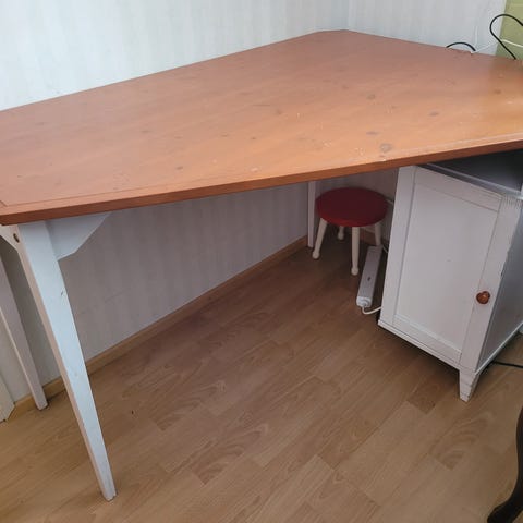 Pähkinänvärinen työpöytä laatikoilla ja kaapilla. Ylimmässä laatikossa lukko ja avain. Todella siisti, ei juuri käytön jälkiä. Laatikoston päädyssä naulojen jälkiä (kuva).