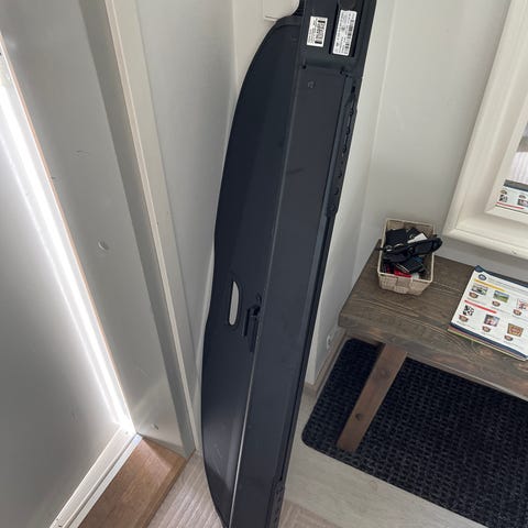 Vaalea tavaratilan rullaverho henkilöautoon. Verhossa on kahva keskellä ja se kiinnittyy auton tavaratilan sivuihin. Sopii tavaratilan peittämiseen ja suojaamiseen. Mercedes Benz GL autoon sopiva ainakin.