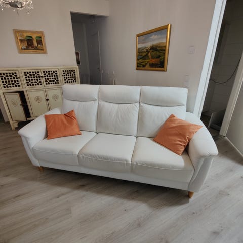 Myydään 10/2022 ostettu konjakinruskea nahka/keinonahka sohva isomman tieltä. Sohva on hyväkuntoinen ja siinä on ainostaan yksi pieni huomaamaton jälki tyynyssä (kts. Kuva).