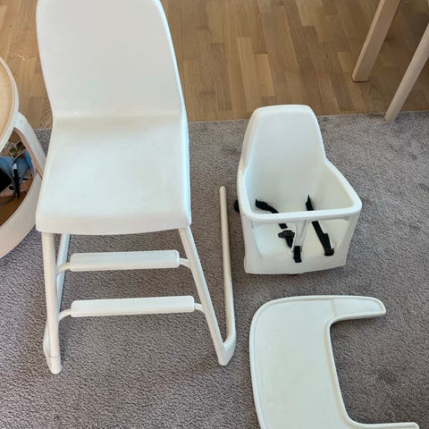 IKEA syöttötuoli, väri valkoinen. Korkea lasten ruokailutuoli, jossa irrotettava tarjotinosa ja turvavyöt. Metallijalat ja muovinen istuinosa on helppo pitää puhtaana. Soveltuu pienille lapsille ruokailuun ja leikkihetkiin pöydän ääressä.
