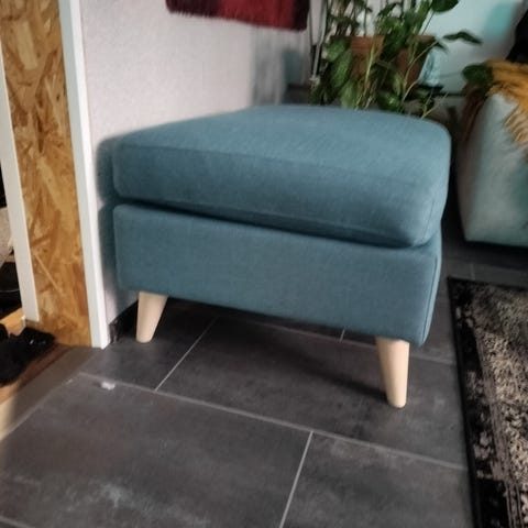 Vaaleanharmaa kangasverhoiltu rahi. Verhoilumateriaalina kudottu kangas, sävy vaaleanharmaa. Runko puuta ja pohjassa jousitus. Jaloissa metalliset, suorakulmaiset jalat. Rahi sopii käytettäväksi esimerkiksi sohvaryhmän jatkeena, jalkarahina tai lisäistuimena. Rahi on hyväkuntoinen ja siisti. Ei ole ollut eläintaloudessa. Kokonaismitat ilmoituksessa.