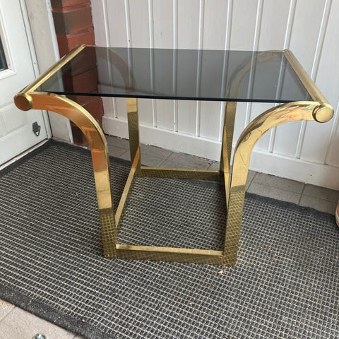 Vintage pyöreä olohuoneen lasipöytä. Tumma pöytälasi, kromijalat. Hyväkuntoinen ja siisti. Muutamasta pöydän jalan putkesta puuttuu kumitassut pöytälasin alta (kuva).