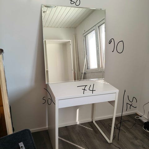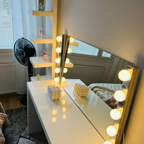 Myydään kaunis ja siistikuntoinen meikkipöytä. Tilava vetolaatikko, jossa valmiina korulokerot – paljon säilytystilaa meikeille ja koruille. Moderni ja näyttävä kokonaisuus esimerkiksi makuuhuoneeseen tai pukeutumistilaan.
